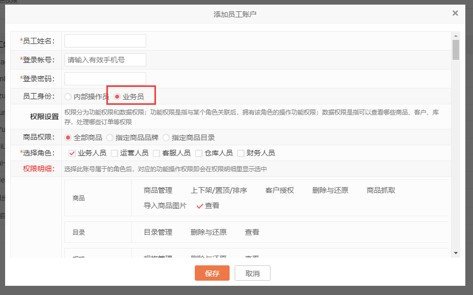 根據公司業務人員負責板塊,給業務員賬號設置商品權限,角色權限以便其快速啟用在線業務工作臺