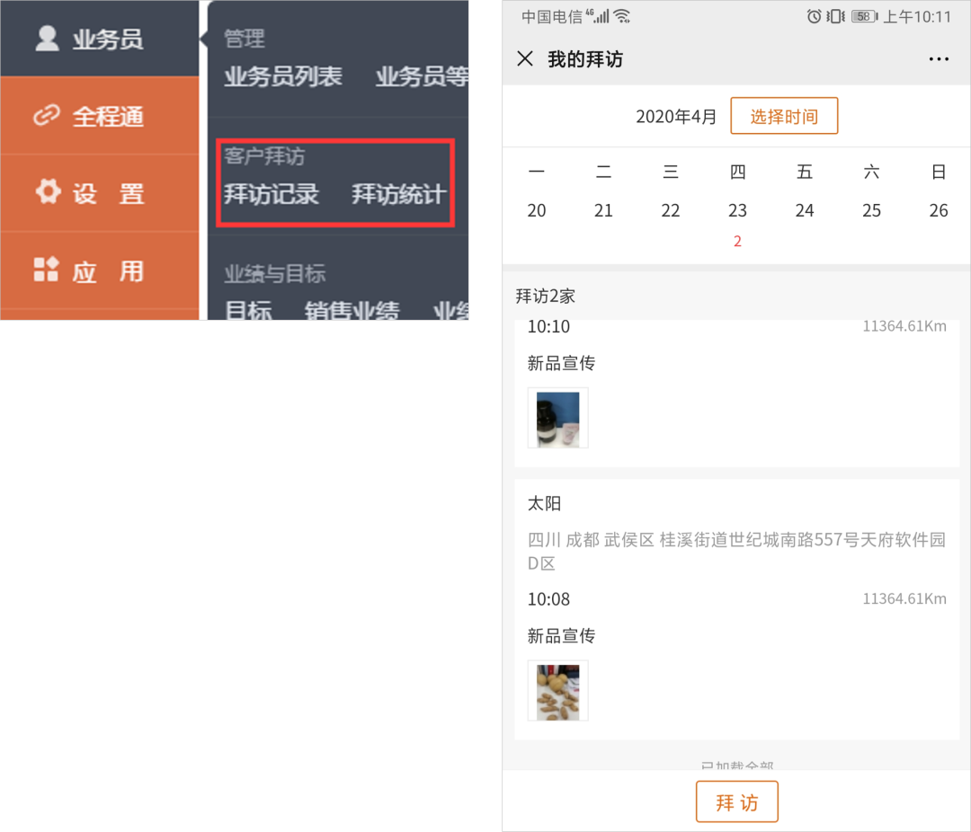 在管理后臺(tái)可以查看業(yè)務(wù)員拜訪出行情況,業(yè)務(wù)員端拜訪功能優(yōu)化升級(jí),可更直觀添加、查看自己的拜訪記錄。