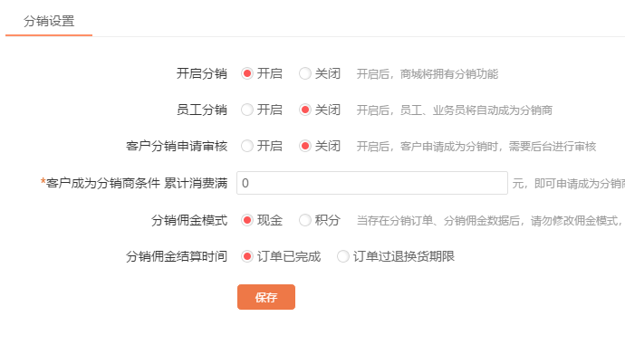 1、后臺(tái)可以開啟或關(guān)閉分銷功能