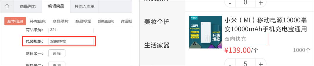 支持商品編輯字段【包裝規(guī)格】,展示在前端商品列表頁。