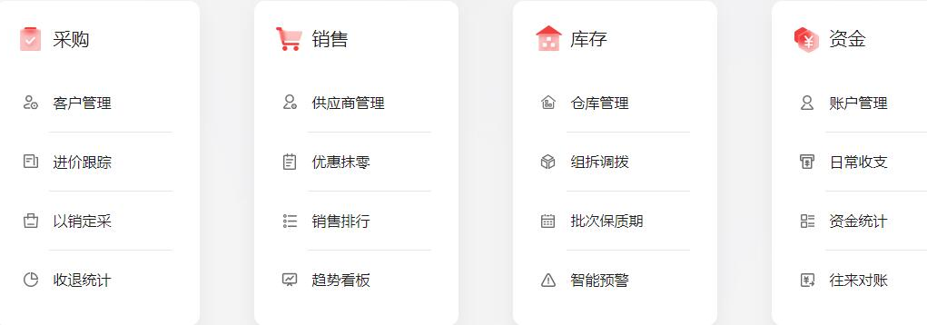 通過采購、銷售、庫存、資金4大模塊,招財貓可以幫助企業(yè)高效管理進、銷、存,輕松管理人、財、物,優(yōu)化業(yè)務流程,提升經(jīng)營效率。真正實現(xiàn)“靈活準確的商品管理,讓資源活起來;及時高效的往來管理,讓資源流起來;方便輕松的員工管理,讓數(shù)據(jù)連起來。”