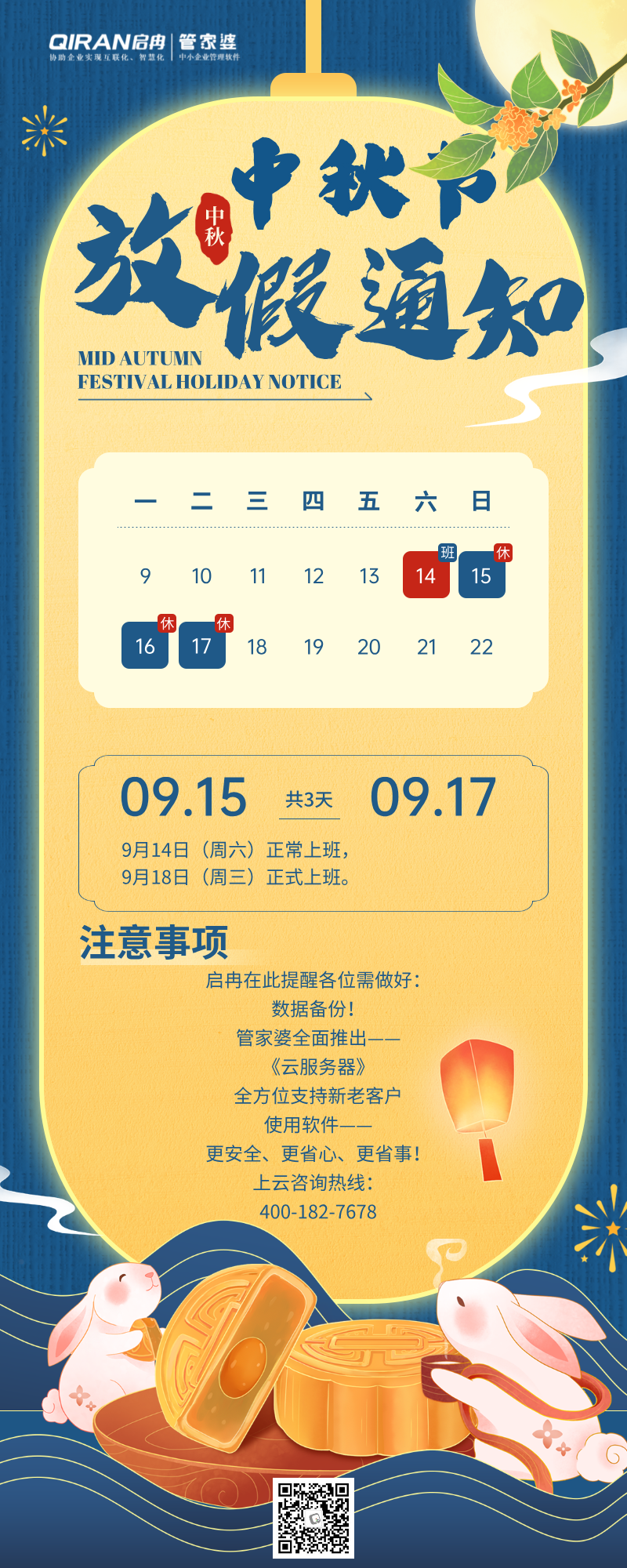 網站首頁 > 管家婆軟件服務中心 > 公告 | 啟冉軟件中秋節放假通知