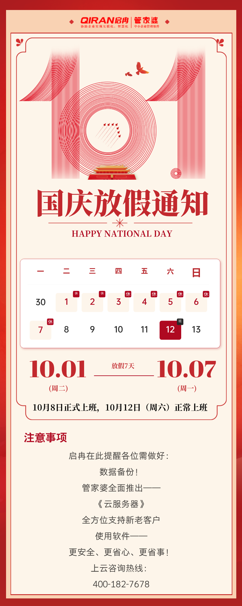 網站首頁 > 管家婆軟件服務中心 > 公告 | 啟冉軟件國慶節放假通知